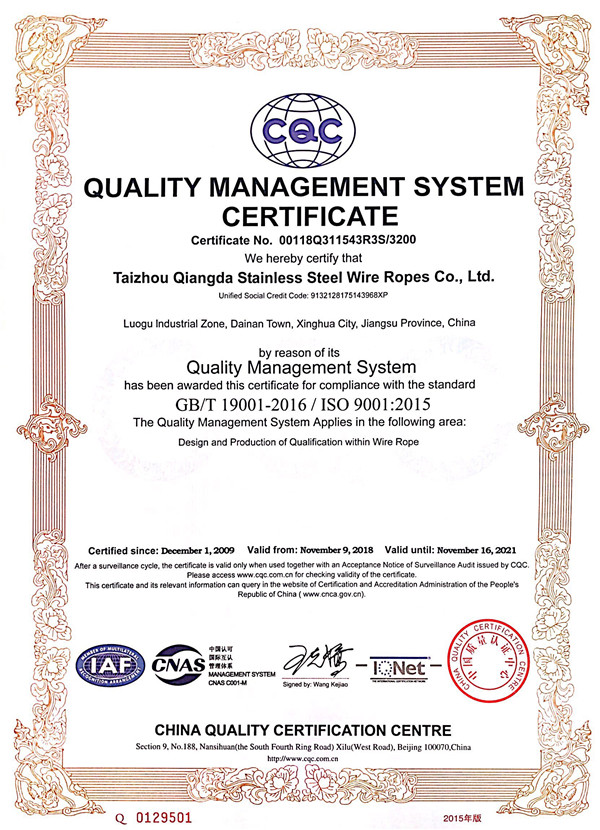 泰州市強達不銹鋼絲繩有限公司位于江蘇興化市戴南經(jīng)濟開發(fā)區(qū),公司致力于不銹鋼絲繩產(chǎn)品生產(chǎn),立志成為“國內(nèi)技術(shù)標(biāo)桿型吊索具生產(chǎn)企業(yè)”。以此戰(zhàn)略思想指導(dǎo),公司堅決貫徹“質(zhì)量贏市場,管理增效益,誠信贏天下”的質(zhì)量方針。以完善的服務(wù)在國內(nèi)不銹鋼絲繩市場樹立良好的品牌形象。公司榮獲“江蘇省質(zhì)量信得過企業(yè)。 靈活的管理機制,經(jīng)驗豐富的